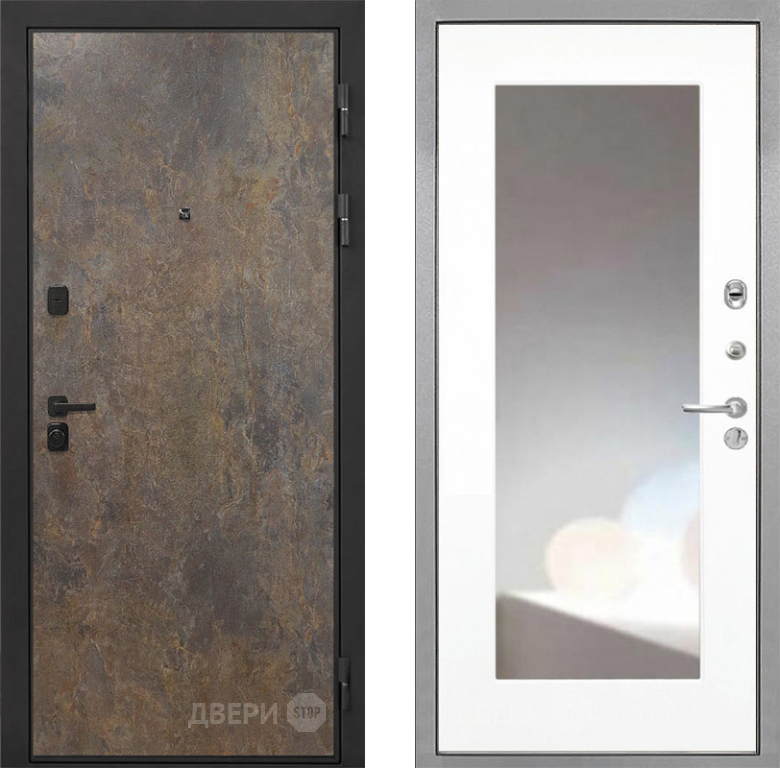 Входная Дверь Интекрон (INTECRON) Профит Black Гранж ФЛЗ-120-М Зеркало Белый матовый 860x2050 мм